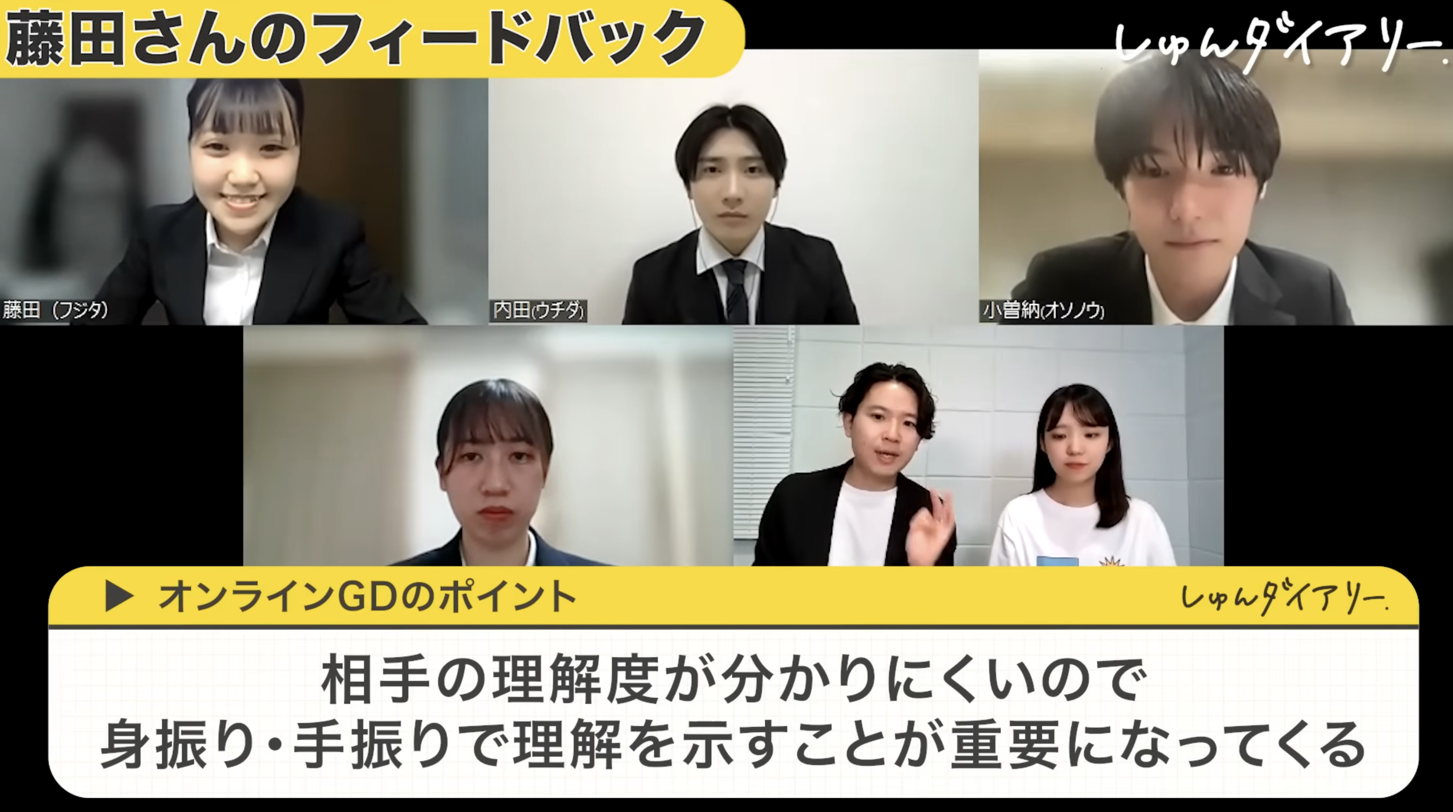 安藤さん:小曽納さんは、持ち前の明るさで場を柔らかくしていたのがとても良かったです。初めて会うメンバー同士のオンラインGDだと、空気が固くなりがちなところを、テンションでほぐせるのは強みです。