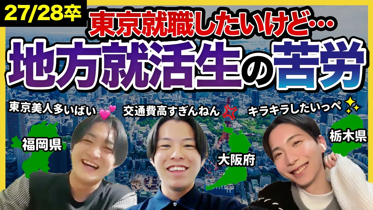 福岡大学、栃木県の大学、大阪大学に通いながら、東京での就職を目指す3人の学生が、地方就活ならではの「情報格差」や「金銭面の苦労」、そして「それでも東京に行きたい理由(本音)」を赤裸々に語ります!地方から上京を目指す就活生にとって、共感できる悩みとその具体的な解決策が詰まった内容です!