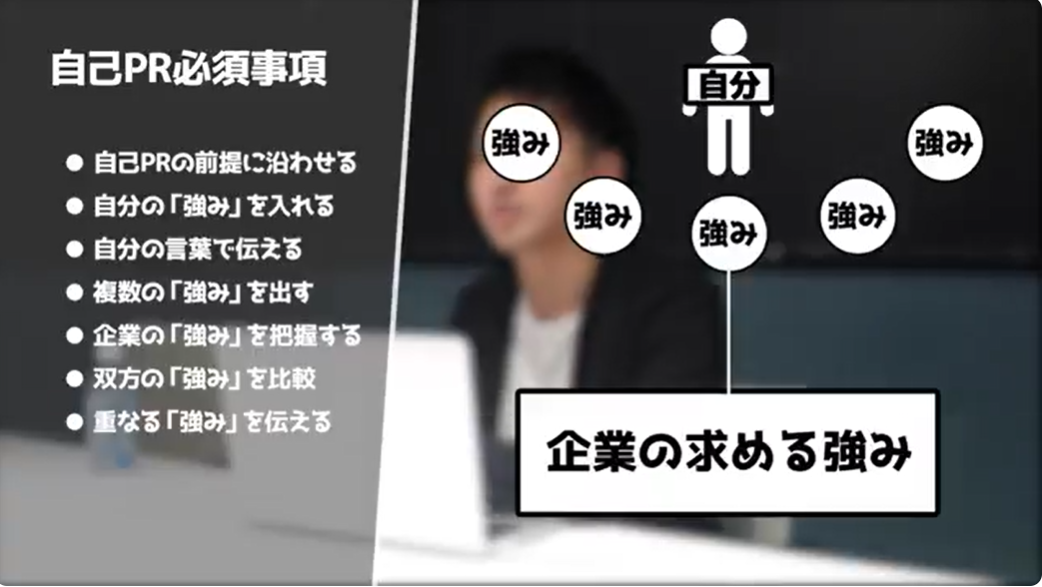 自己PRは「自分らしさ」が見えないと説得力が出ない強みは複数あってOK。そこから企業に合うものを選ぶ。“前向き”“努力家”など汎用ワードはNG。経験に裏付けされた言い方に変え企業の“求める人物像”と照らして、自然にマッチする強みを採用する