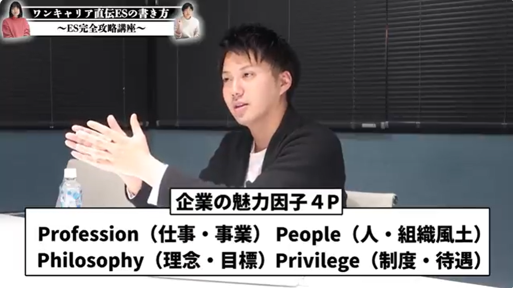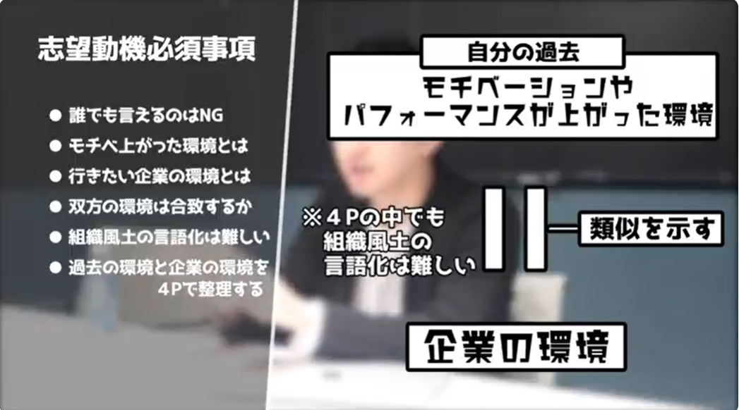 志望動機は“誰でも言える理由”を避ける。仕事・人・組織風土・制度(4P) の4軸で経験と企業を紐づける。経験が3つ以上あると一気に説得力が増す。“企業の言葉”を使うと志望度が伝わりやすい(OB訪問やサイトで確認可能)