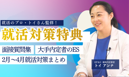 会員限定【2月限定特典】納得内定の近道!就活スタートキット🎁就活解禁まであと1ヶ月! 2月限定の特典!トイアンナさん監修の就活スタートキットをプレゼント! 2026年2月2日目次3月の就活解禁まであと1ヶ月。こんな人におすすめ!【1次・2次・最終】面接頻出質問集2月〜4月の就活対策まとめ大手内定者のES(エントリーシート)いいね