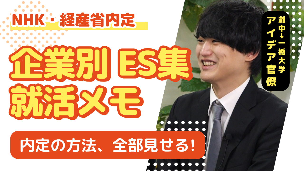 ES対策,特典,面接対策会員限定NHK・経産省内定『企業別ES集』『就活攻略メモ』灘中→一橋大学→NHK・経産省内定!超エリート街道を進む『アイデア官僚』のES・就活攻略法を大公開!2026年2月26日目次アイデア官僚の就活攻略メモ企業別エントリーシート模擬面接がレベチすぎたいいね11人がいいねしました