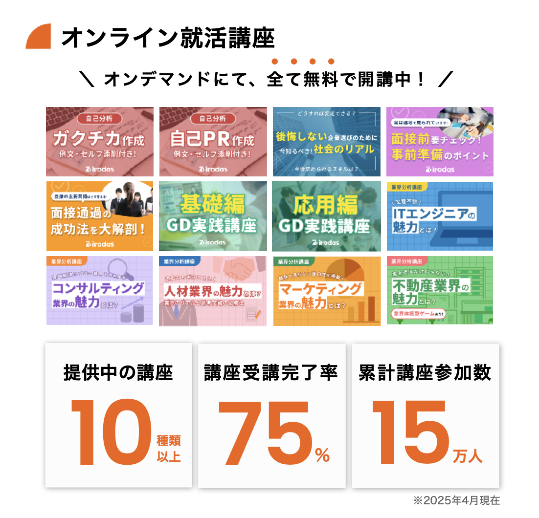 自己分析、業界分析(IT、マーケティング、不動産など)、GD対策、面接対策など、本来有料級のノウハウが詰まった講座を無料で受講いただけます✨