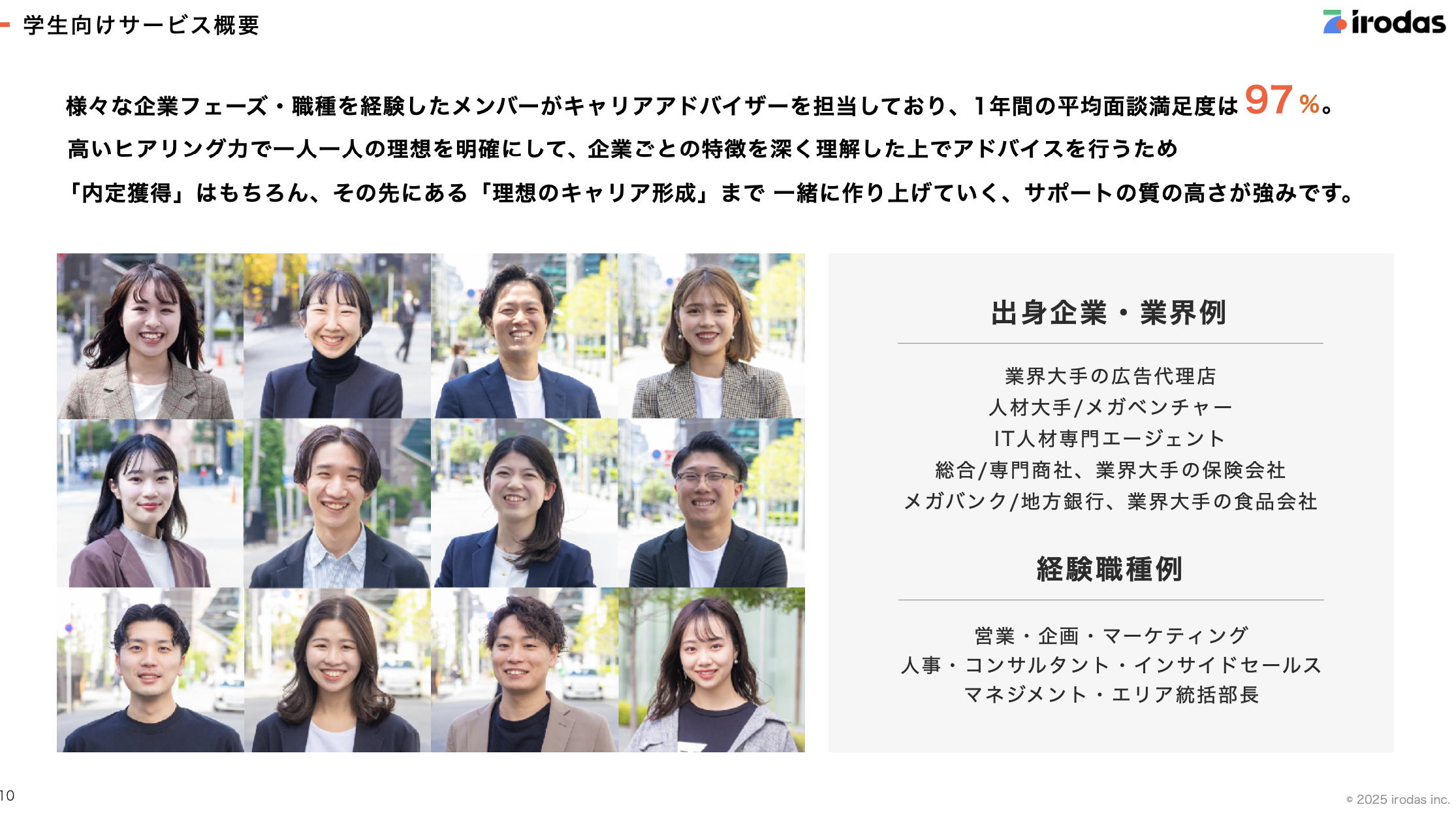 irodasでは、様々な業界(広告、人材、商社、ITなど)や職種を経験したプロのキャリアアドバイザーが専属であなたをサポートします。
