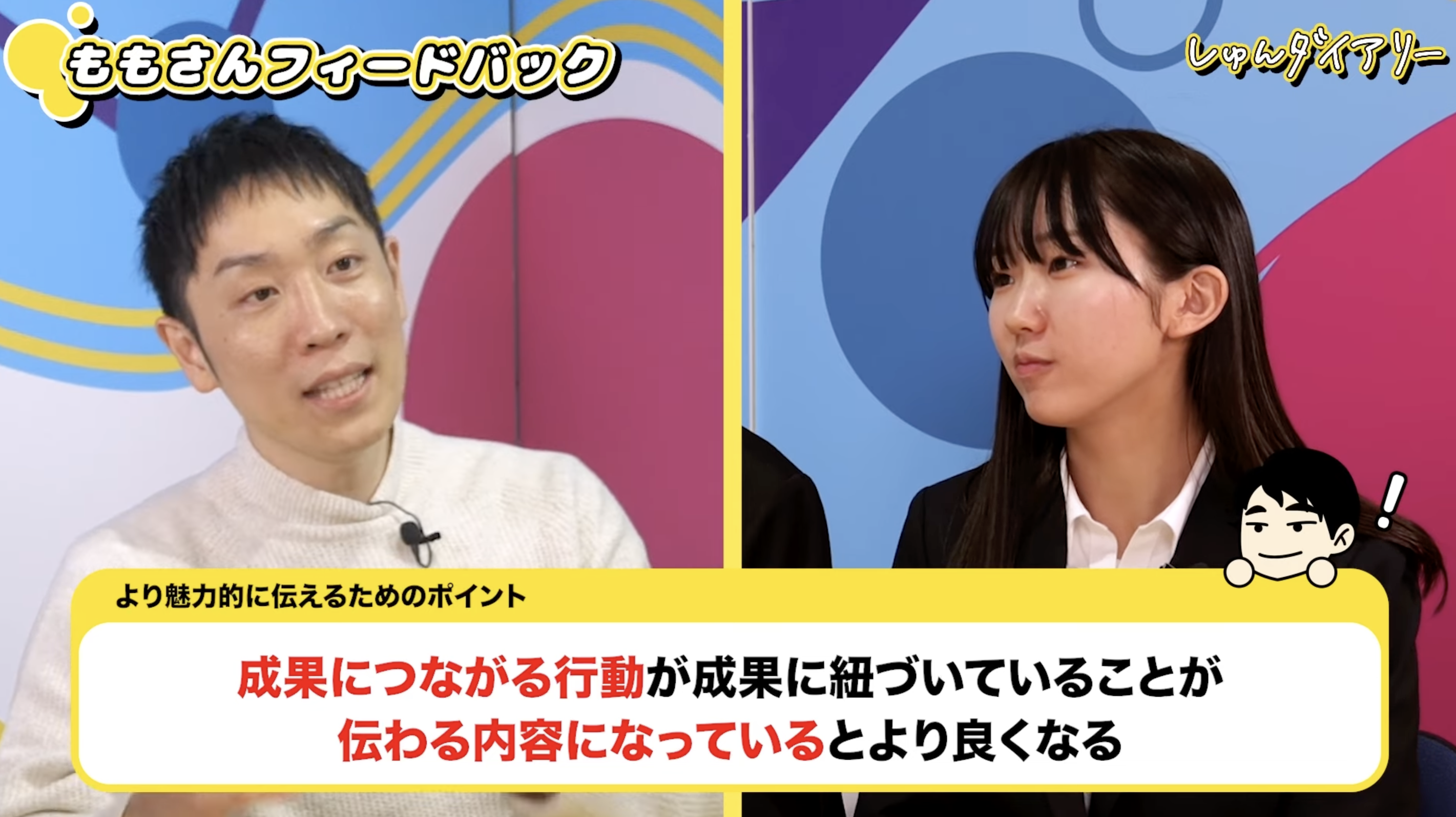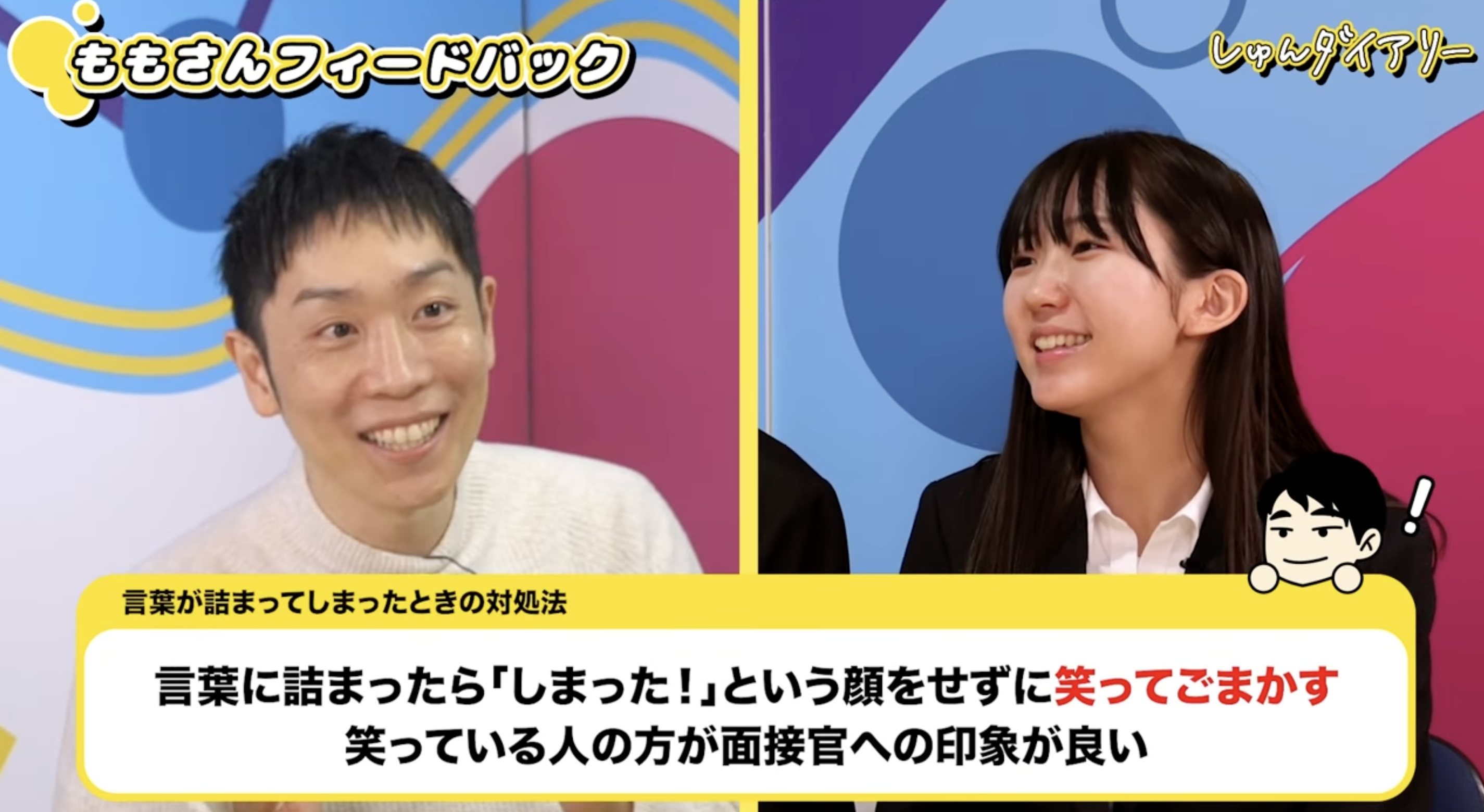 岡本さん:ももさんの自己PRでもそうでしたが、話している途中で言葉が詰まってしまう瞬間は、誰にでもあります。そのときに「やばい…」「どうしよう…」という表情になってしまうと、自分で自分を追い込み、ますます話せなくなってしまう悪循環が起きます。