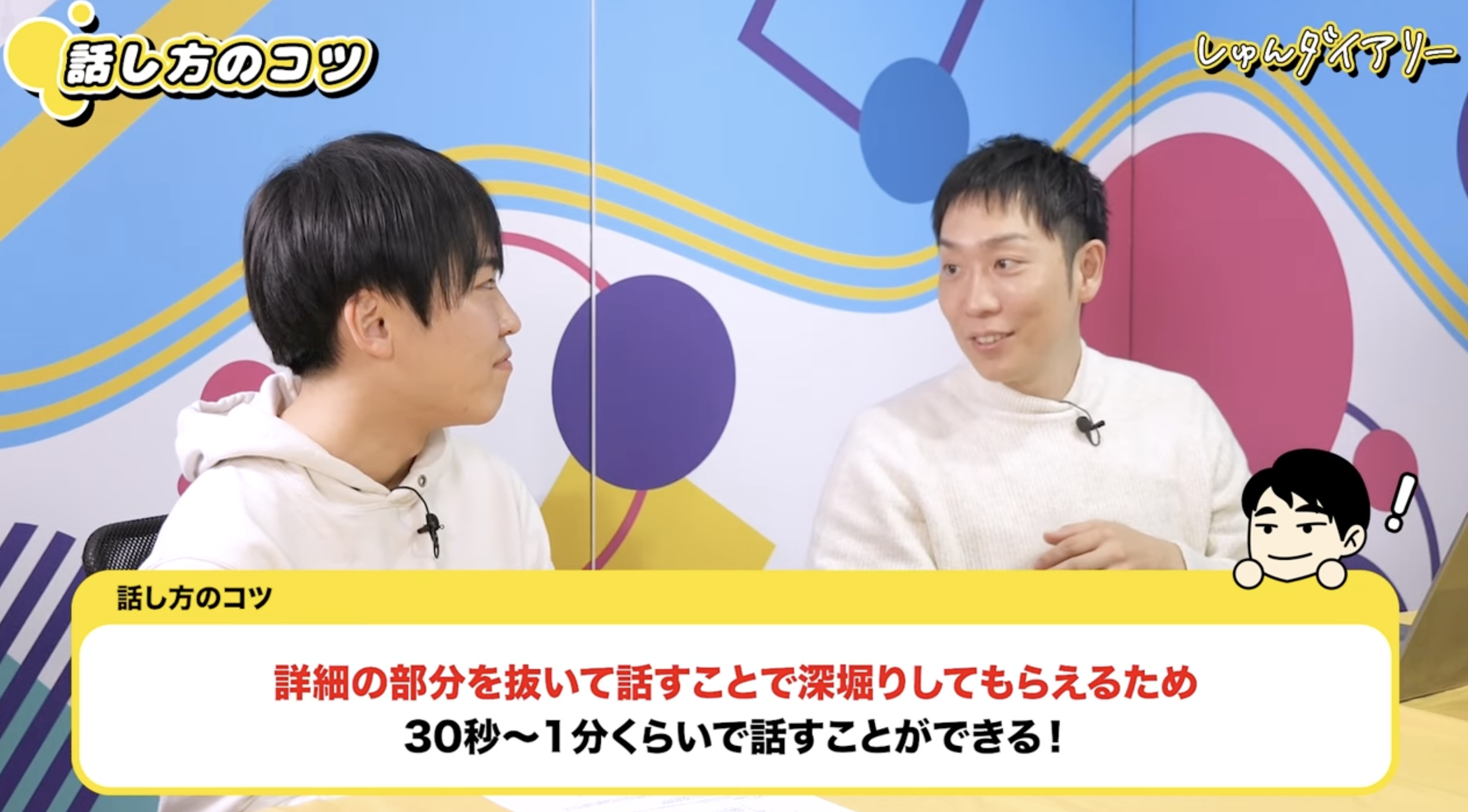岡本さん:面接で「自己PRをお願いします」と言われたとき、最初から全部を3分くらいで話し切る人が多いのですが、これはあまりおすすめしません。面接はあくまで“会話”なので、最初の1ターンは30〜60秒くらいで切り上げ、面接官が深掘りしたくなるポイントを残しておく方が良いです。