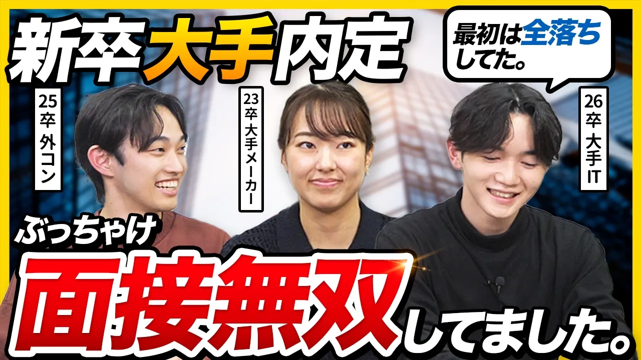 面接対策,就活体験談会員限定【面接必勝法】難関企業内定者が語る、面接対策のすべて難関企業(IT、メーカー、コンサル)の内定を獲得した3名の先輩が語った実体験をもとに、「面接」を突破するためのノウハウをお伝えします!2026年2月27日目次はじめに自己紹介と自己PR(ガクチカ)の極意説得力のある志望動機の作り方逆質問と想定外の質問への対応面接の練習方法と緊張対策重要なポイント(まとめ)いいね#内定獲得