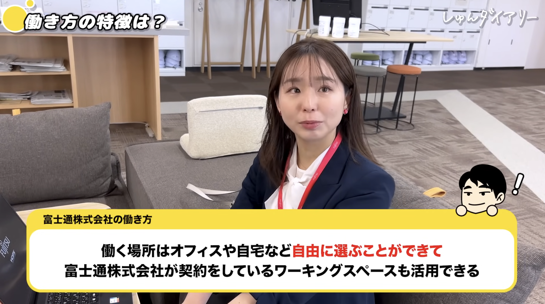 自由度の高いワークスタイル 富士通では、出社時間を調整できるフレックスタイム制やリモートワークが導入されています。戸田さんの出社時間も日によって10時や午後になることがあり、会社が契約しているワーキングスペースの活用も含め、働く場所を自由に選べる「働きやすい環境」が整っています。
