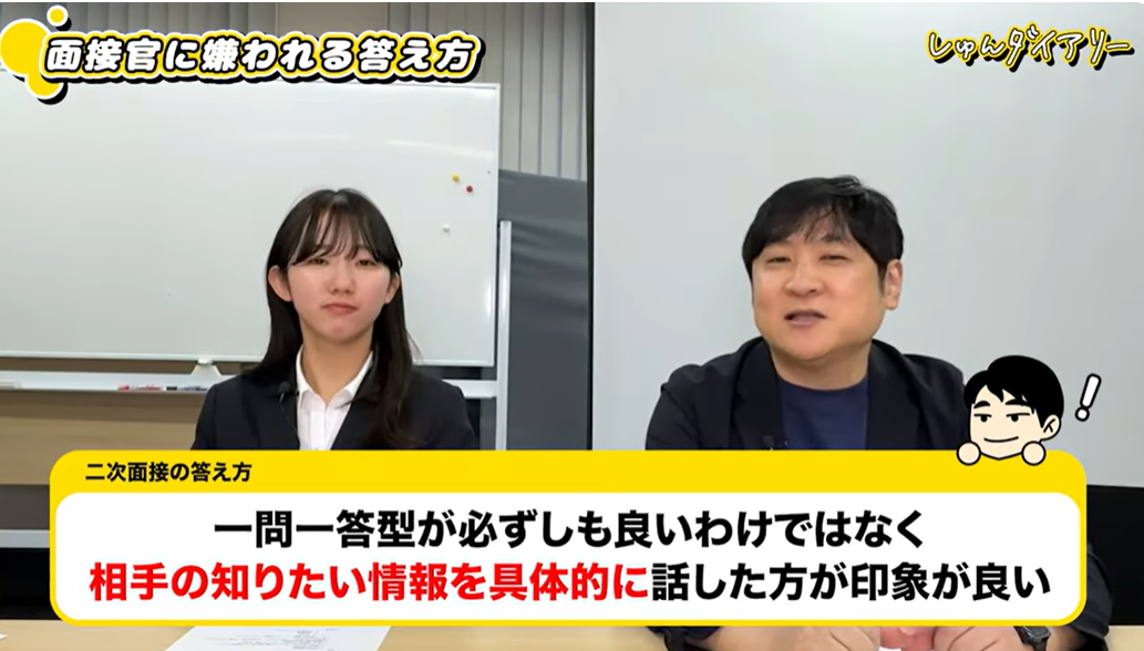 ソワ:そうなんです。一問一答型は面接官からすると嫌われます。「クラブ何やってますか?」「アメフトです。」以上、みたいなの。向こうとしては「ポジションとか役割とか、次の質問のヒントになること言ってよ…」って思ってるんですよ。