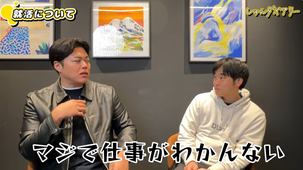 芦名:大学3年の終わりくらいに、周りがザワザワし始めて。「OBが説明会やってるから来いよ」って言われて、なんとなく会社説明会に行って。でも正直、就活の意味が全く分かんなかった。就活ガチ勢のチームメイトに「メーカーって何? 商社って何?」ってプレゼンしてもらっても、聞いててマジでピンとこない。「業界なんて言い方変えてるだけで、実は全部同じじゃない?」って思ってましたね。
