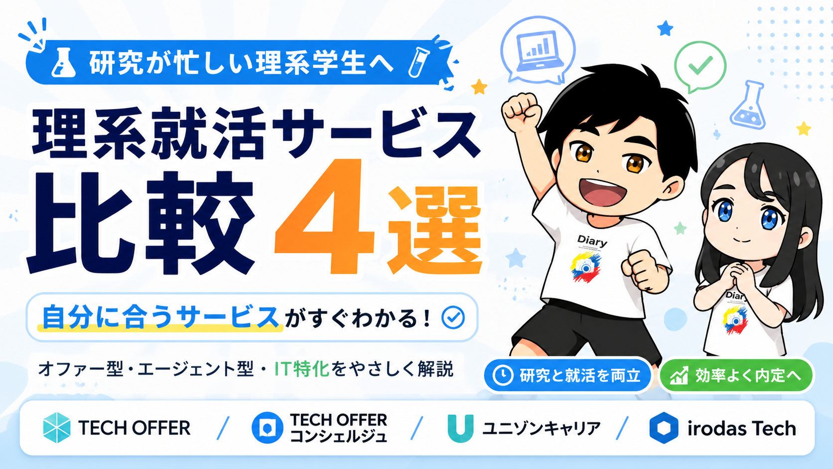 会員限定【理系就活】研究が忙しくても効率的に進められる!理系特化のおすすめ就活サービスを徹底比較研究や実験で忙しい理系学生へ。スカウト型・エージェント型・IT特化など、理系就活に強いサービスをタイプ別早見表+比較表で徹底解説。研究と両立しながら、自分に合った1社が3分で見つかります。しゅんダイアリー編集部2026年4月27日いいね