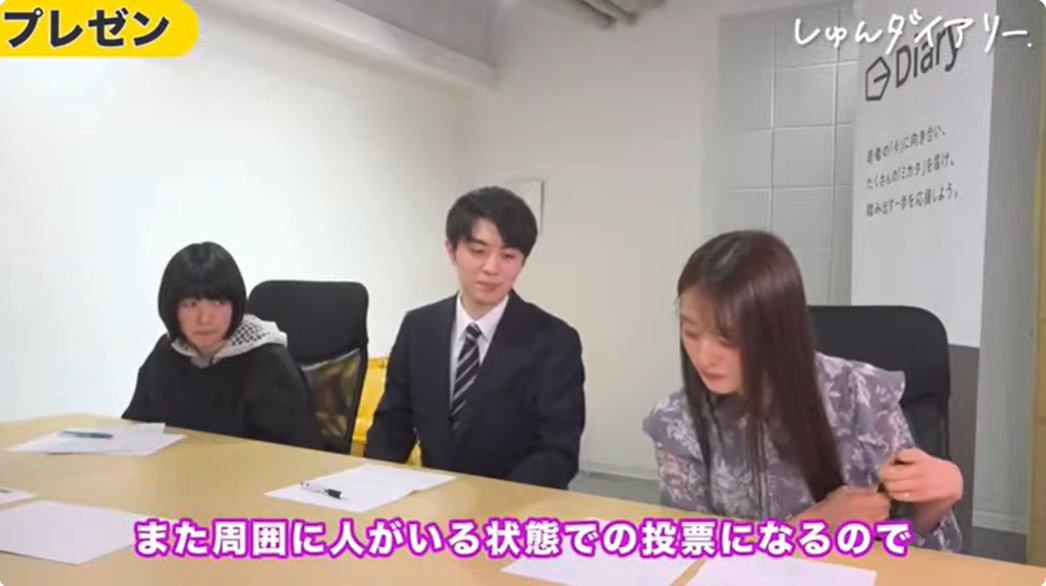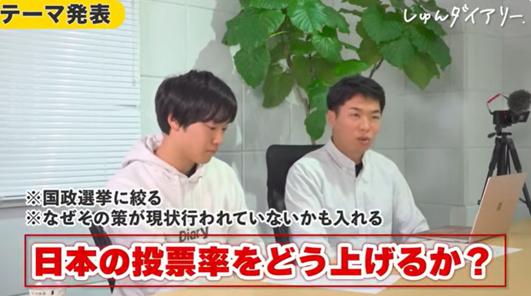 しゅん:ありがとうございます。じゃあ今日のテーマを発表します。「日本の投票率をどう上げるか」。今、大体50%くらいと言われている投票率を、1.5倍の75%にしたい。予算は100億円くらい、期間は次の衆議院選挙までの2年以内。この前提で考えてください。