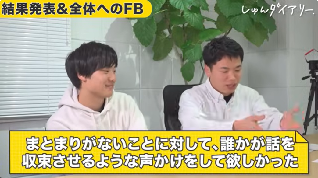 最後のトピックでは、発表内容の全体像がまとまり、そのうえでセカニチさんから「就活GD的な改善ポイント」がフィードバックされています。良かった点は、コミュニケーションの雰囲気や、ターゲットを途中で意識できたこと。一方で、議論が広がりすぎたのを収束する役割がいなかった施策の「なぜ現状やっていないのか」「導入したときのデメリット」に十分踏み込めていない。ターゲットの定義(若者=何歳くらい)があいまい。といった点が課題として挙がりました。就活のGDでは、「なぜ?」と一段深く考えることと、「ここで一回整理しましょう」と流れをまとめる役割ができると、評価が一気に上がります。