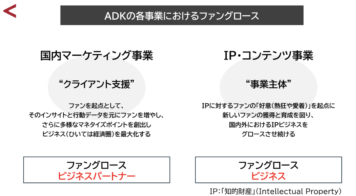 石田様:私たちは現在、「マーケティング事業」と「IP・コンテンツ事業」の2つを大きな柱としています。この2つの知見を掛け合わせたADK固有のアプローチ方法がファングロース戦略です。