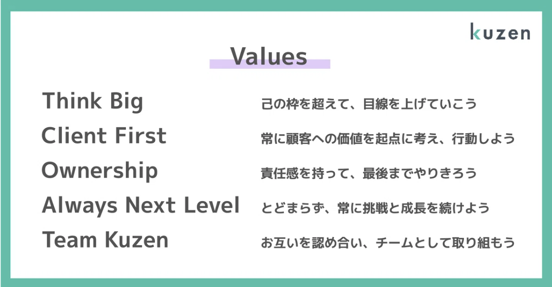中野様: 私たちが大切にしているのは「Team KUZEN(協力する)」と「Client First(顧客思考)」という価値観です。営業職というと「個人の力で売り切る」イメージがあるかもしれませんが、当社で活躍しているのは、一人で自立するというよりも、チームで連携して成約に結び付けられる人です。